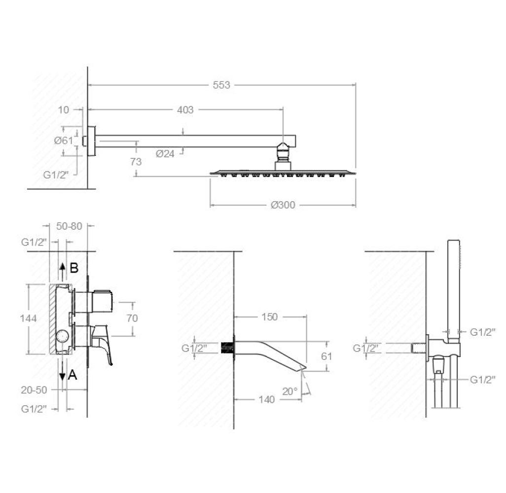 Urban Chic, conjunto monomando empotrado 3 vías con soporte, toma de agua, caño de bañera, teleducha y rociador de Ø300mm. Acabado oro cepillado de alta resistencia por su tratamiento PVD.