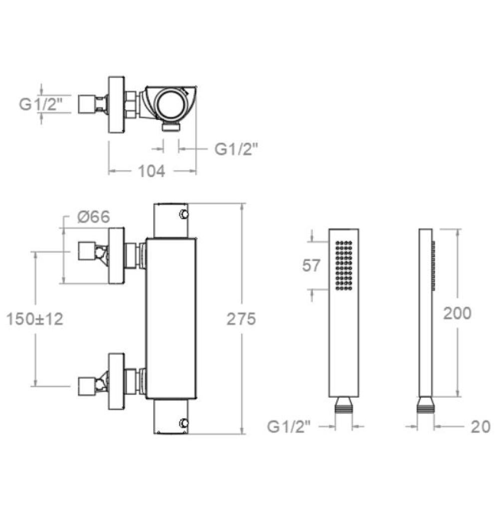 Conjunt aixeta de dutxa termostàtica amb prestatgeria amb vidre de seguretat, teledutxa quadrada 1 posició anti-cal i flexo d'alta resistència 1,75m antigiratori amb sistemes termostop limitador de temperatura, hotblock, níquel raspallat d'alta resistència pel seu tractament PVD.