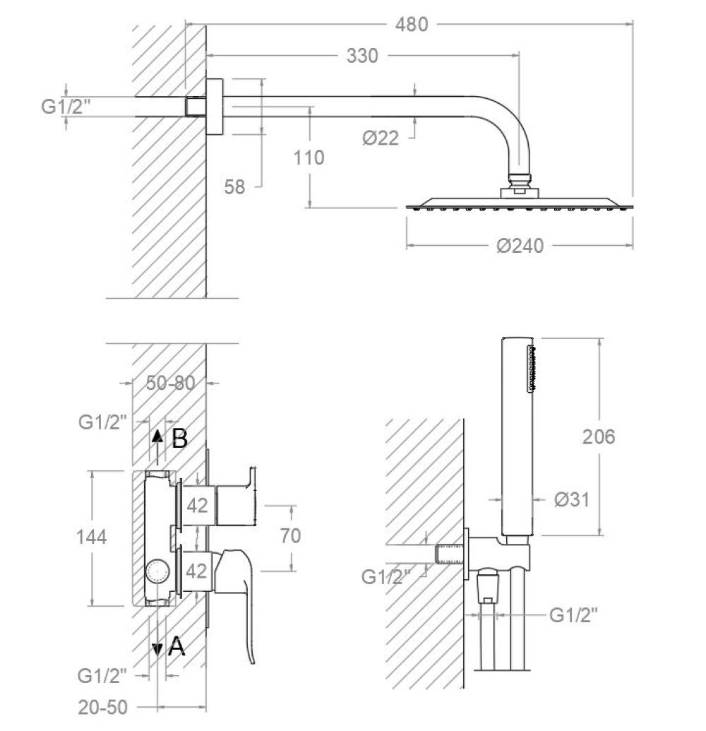 Conjunt aixeta de dutxa encastat de 2 sortides amb suport, presa d'aigua, rociador mural ABS hidrooxigenat de Ø240mm, teledutxa cilíndrica minimalista ABS i flexo color metàl·lic alt brillantor 1,75m antigiratori Soleflex, sistema S2 d'estalvi d'aigua del 50%, limitador de temperatura i cromat Diamond Finish.