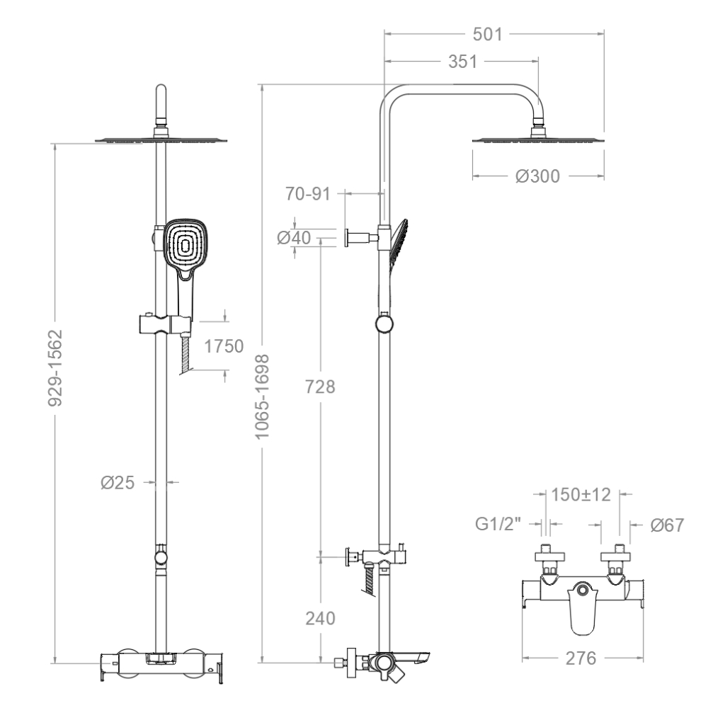 Columna de dutxa i banyera telescòpica termostàtica d'inox 1060-1640mm, amb aspersor metàl·lic rodon Ø300mm, dutxa de mà ABS semiquadrada de 3 funcions anti-cal, flexo color metàl·lic alt brill 1,75m antigiratori Soleflex. Acabat coure raspallat d'alta resistència per al seu tractament PVD.