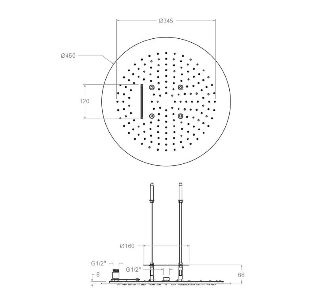 Dutxa empotrada rodona amb cascada de Ø450mm de 2 vies. Antical i acabat cromat d'alta resistència.