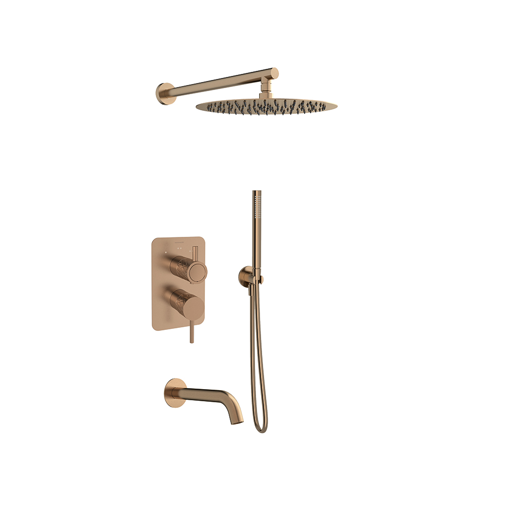 Odisea Joia, conjunt termostàtic encastat de 2 vies amb dutxa de mà i aspersor metàl·lic de Ø300 mm, or raspallat Odisea Joia, conjunt termostàtic encastat de 2 vies amb dutxa de mà i aspersor metàl·lic de Ø300 mm, or raspallat