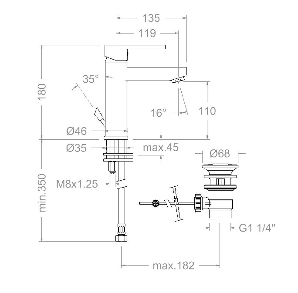 Aixeta de lavabo altura M amb vàlvula automàtica d'inox 1¼" Ref.1169, cromat Diamond Finish, sistema S2 d'estalvi d'aigua del 50%, limitador de temperatura i sistema anticorrosió patentat