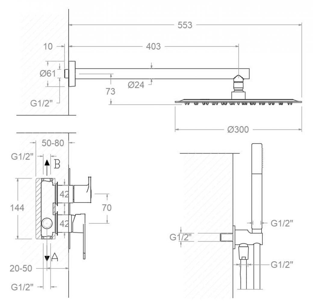 Conjunt monomando encastat 2 vies amb rociador metàl·lic Ø300 mm, acabat cromat Diamond Finish d'alta resistència, sistema termostop limitador de temperatura i sistema anticorrosió patentat.