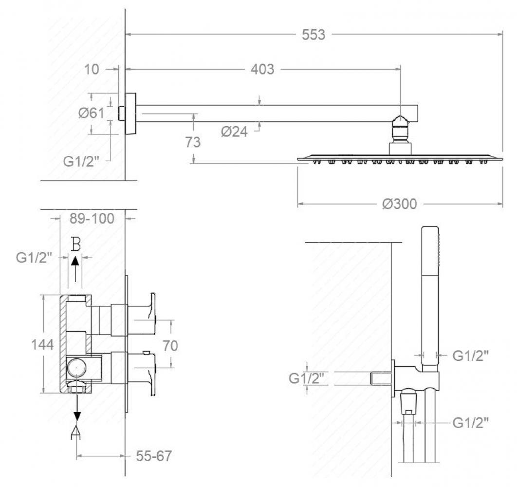 Conjunt termostàtic encastat de 2 vies amb ruixador metàl·lic Ø300 mm, sistema termostop limitador de temperatura i sistema anticorrosió patentat. Acabat grafit d'alta resistència per al seu tractament PVD.