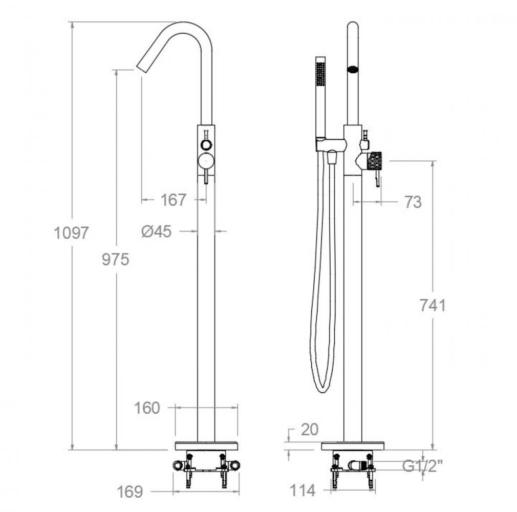 Aixeta monocomandament en columna de peu per a banyera de línia esvelta, amb fixació al terra estable i resistent, inclou teledutxa cilíndrica minimalista i flexible 1,75m amb extrem giratori, coure raspallat d'alta resistència per al seu tractament PVD.