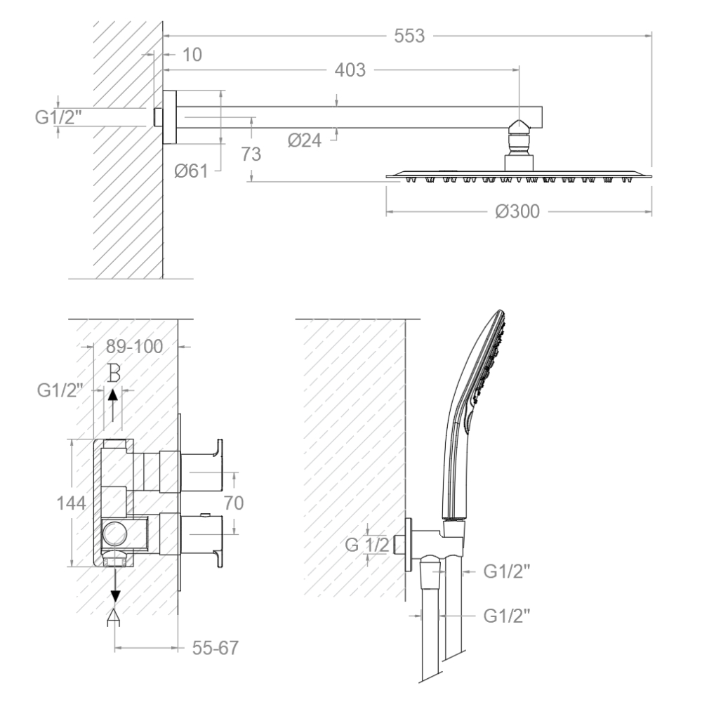 Conjunt termostàtic encastat de 2 vies amb suport, presa d'aigua, teledutxa anti-cal semi-quadrada i rociador rodó de Ø300mm, amb Sistema Hot Block de seguretat anti cremades i sistema Termostop de bloqueig de temperatura, sistema anticorrosió patentat i acabat cromat Diamond Finish d'alta resistència.