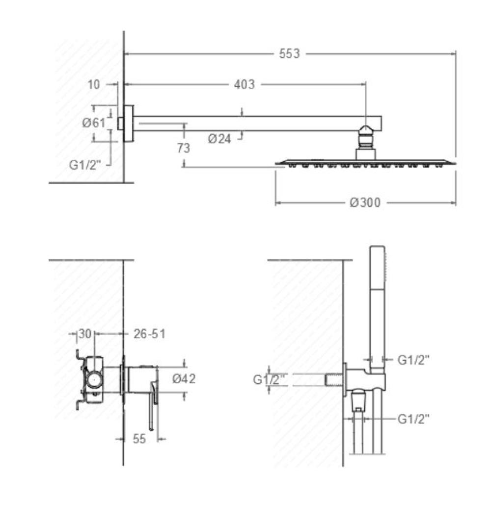 Alexia, conjunto monomando empotrado horizontal 2 vías con teleducha y rociador de Ø300mm, negro mate