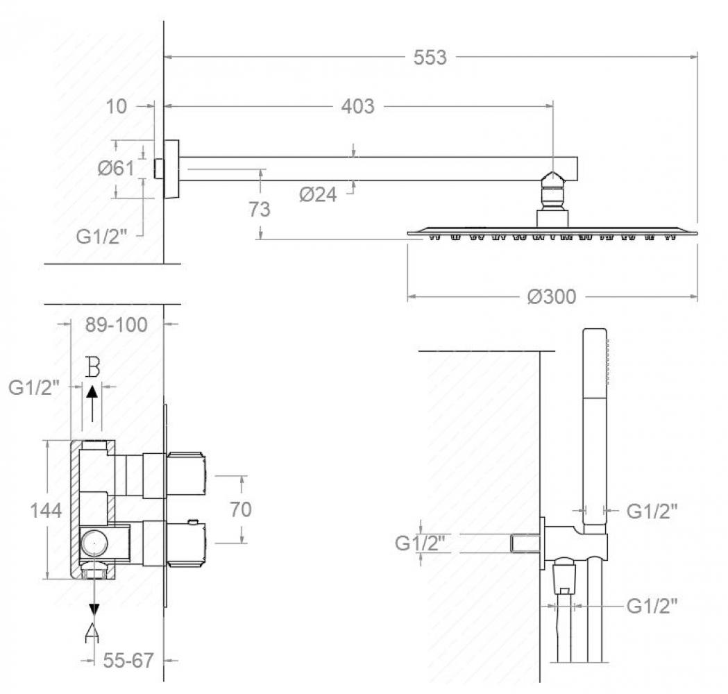 Urban Chic, eingebautes thermostatisches Metall-Set mit 2 Wegen und 300 mm Metall-Duschkopf, Chrom.