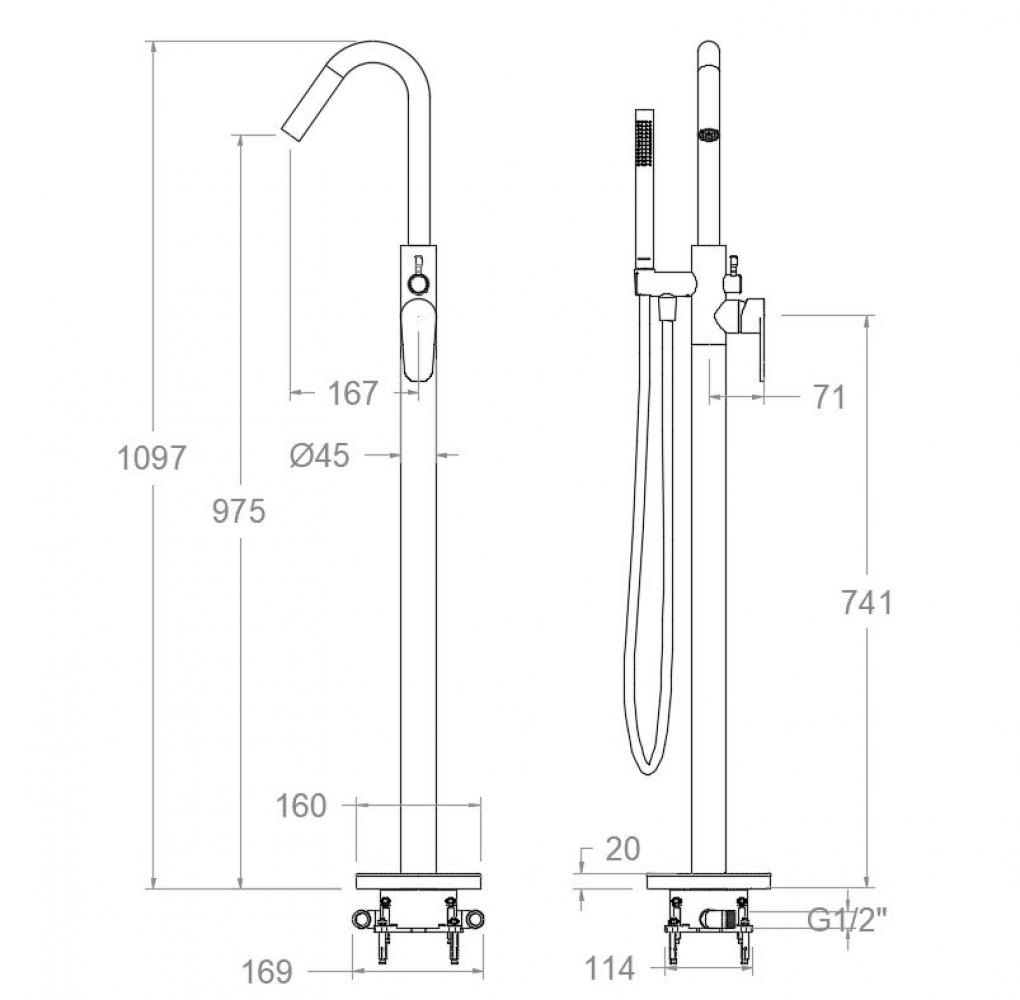 Einhebel-Wannenfüll- und Brausebatterie Standsäule schwarz matt hohe Widerstandsfähigkeit durch elektrostatische Beschichtung, Bodenbefestigung, mit Metall-Stabhandbrause antikalk 1jet und Kunststoff-Brauseschlauch