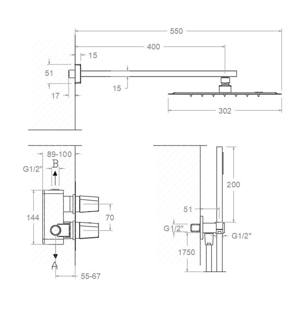 Unterputz-Duschthermostat-Set mit 2 Wegen und 300 mm Metall-Duschkopf, mit Thermostatkartusche und Hot Block Sicherheitssystem gegen Verbrühungen sowie Termostop-System zur Temperaturbegrenzung bei 38°. Cooltouch-System, das die Armatur kühl hält, um Verbrennungen zu vermeiden. Hochbeständiges mattes Schwarz-Finish dank elektrolytischer Behandlung auf galvanisiertem Untergrund.