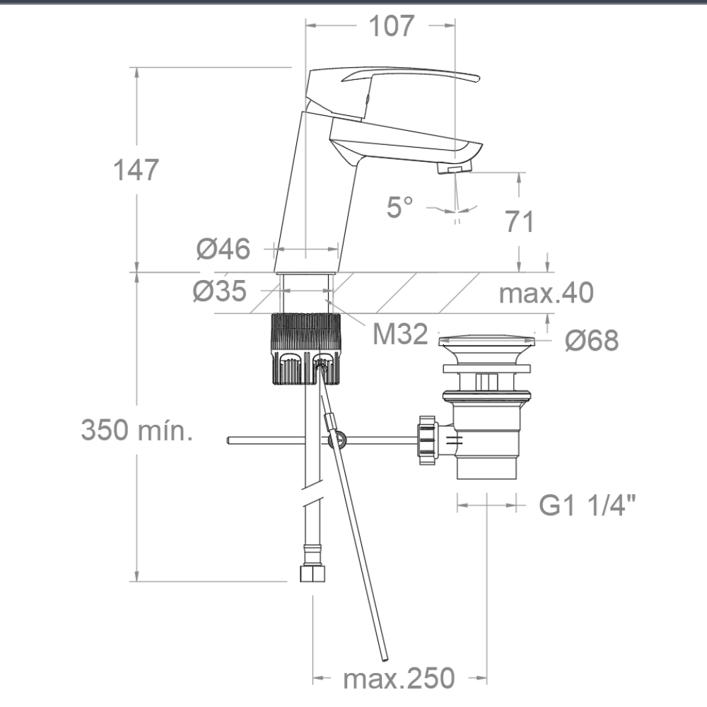 New Fly, Breeam, geneigter Einhebel-Waschtischarmatur mit automatischem Edelstahlventil 1¼ und S3-System mit Kaltwasseröffnung, Chrom.
