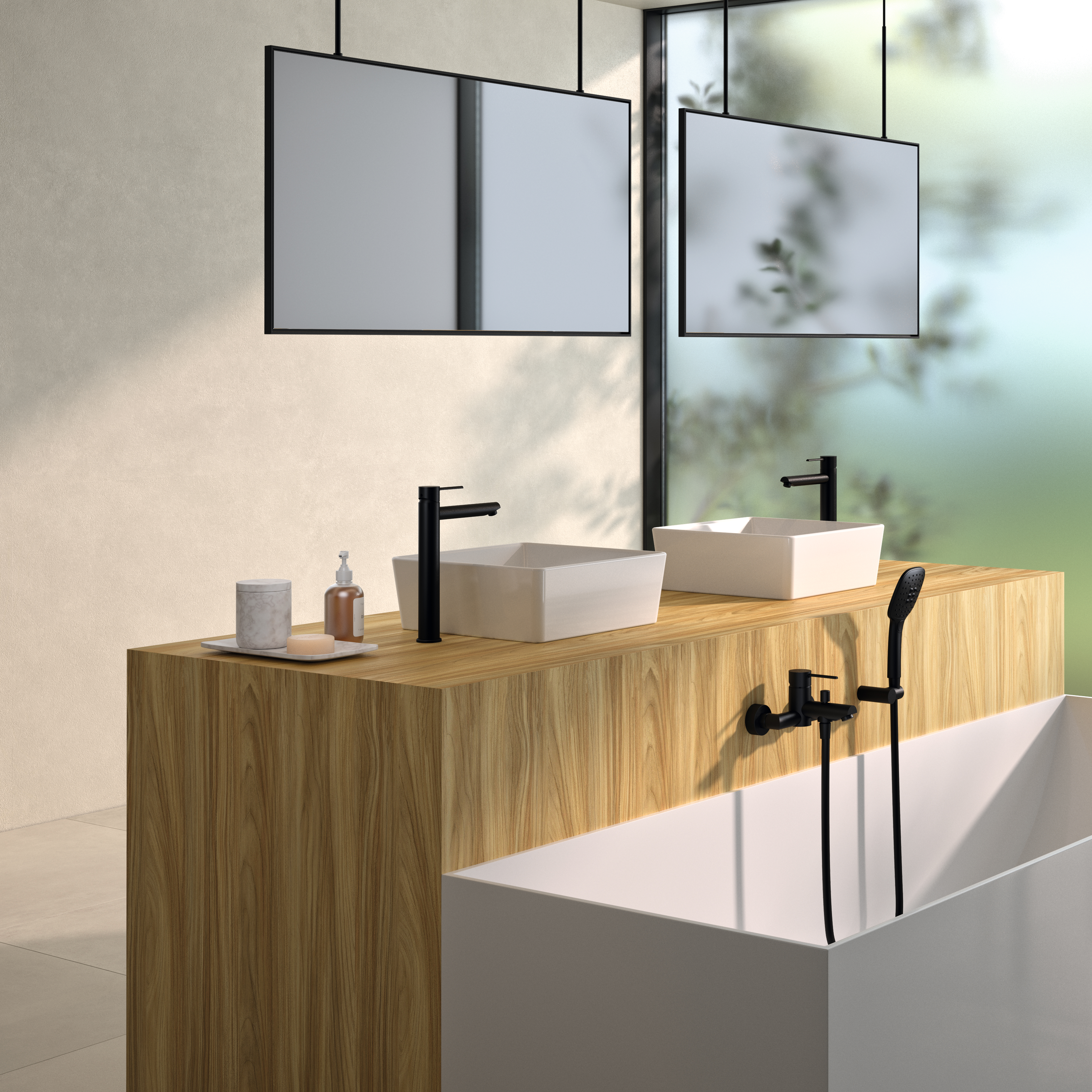 Einhebelmischer für Waschbecken XL Mamma Mia, SH3, 5-Liter-Begrenzung mit Kaltwasseröffnung. Hochbeständige mattschwarze Oberfläche dank elektrostatischer Behandlung auf verzinkter Unterlage.