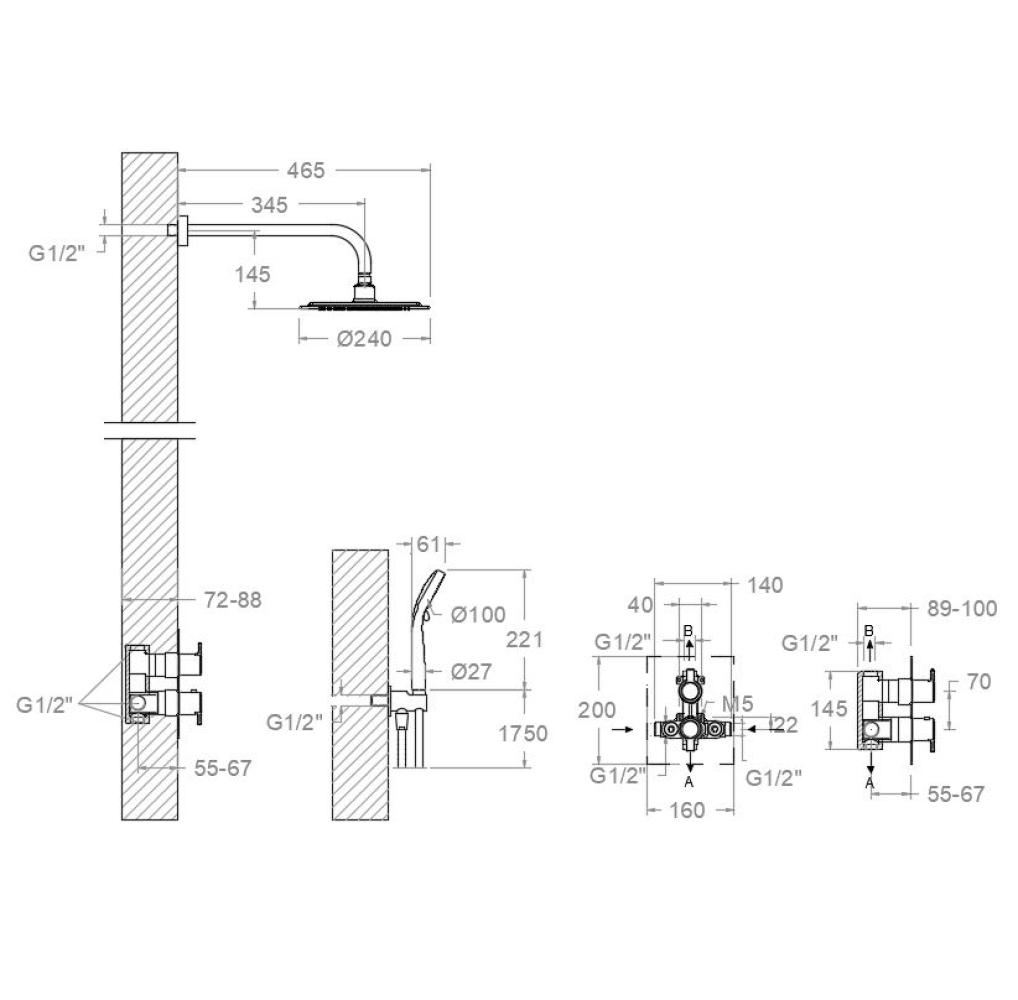 UP-Thermostat Set 2 Wege, Brauses-chlauch-Wandanschluss mit Handbrause-halterung, Brauseschlauch, Handbrause und Regenbrause Ø 240mm (ABS)