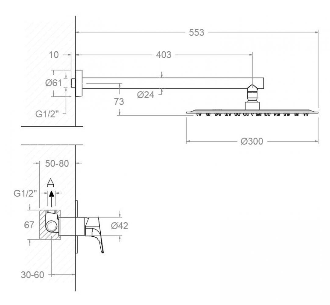 Recessed single-handle shower set with 1-way control and Ø300mm metal showerhead, ultraslim metal plate, easy to install due to its compact body, S2 water-saving system with 50% savings, and temperature limiter. Brushed gold finish with high resistance due to its PVD treatment.