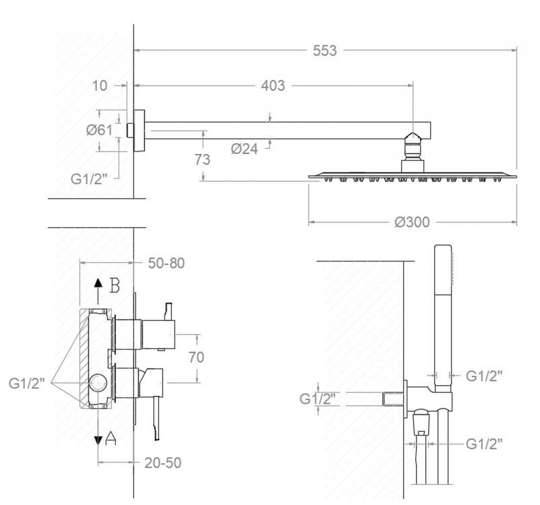 Single-lever built-in shower mixer, 2-way, with 300mm round metal showerhead and handheld shower. S2 water-saving system with 50% savings and temperature limiter. High-resistance brushed copper finish due to its electrostatic treatment over galvanizing.