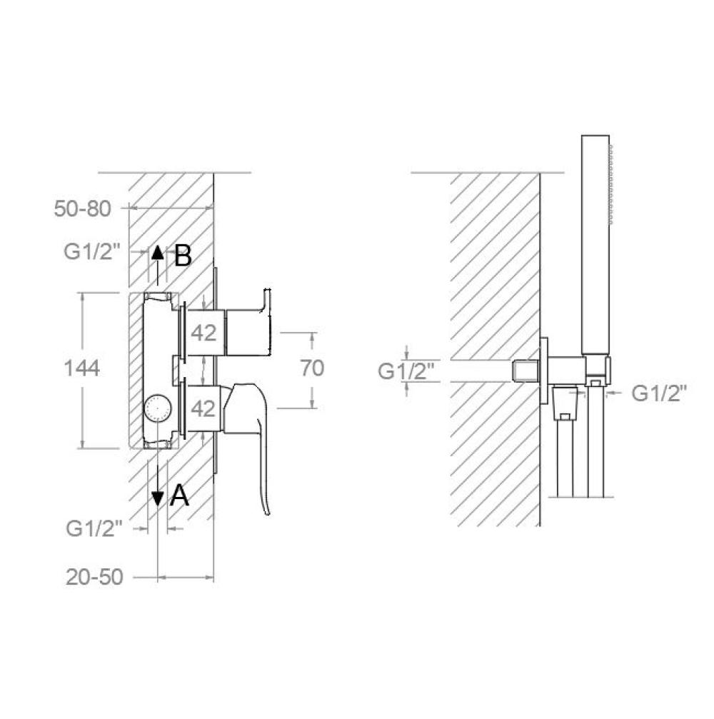Ypsilon Plus, conjunto monomando empotrado metálico 2 vías con soporte, toma de agua, teleducha y rociador, cromo
