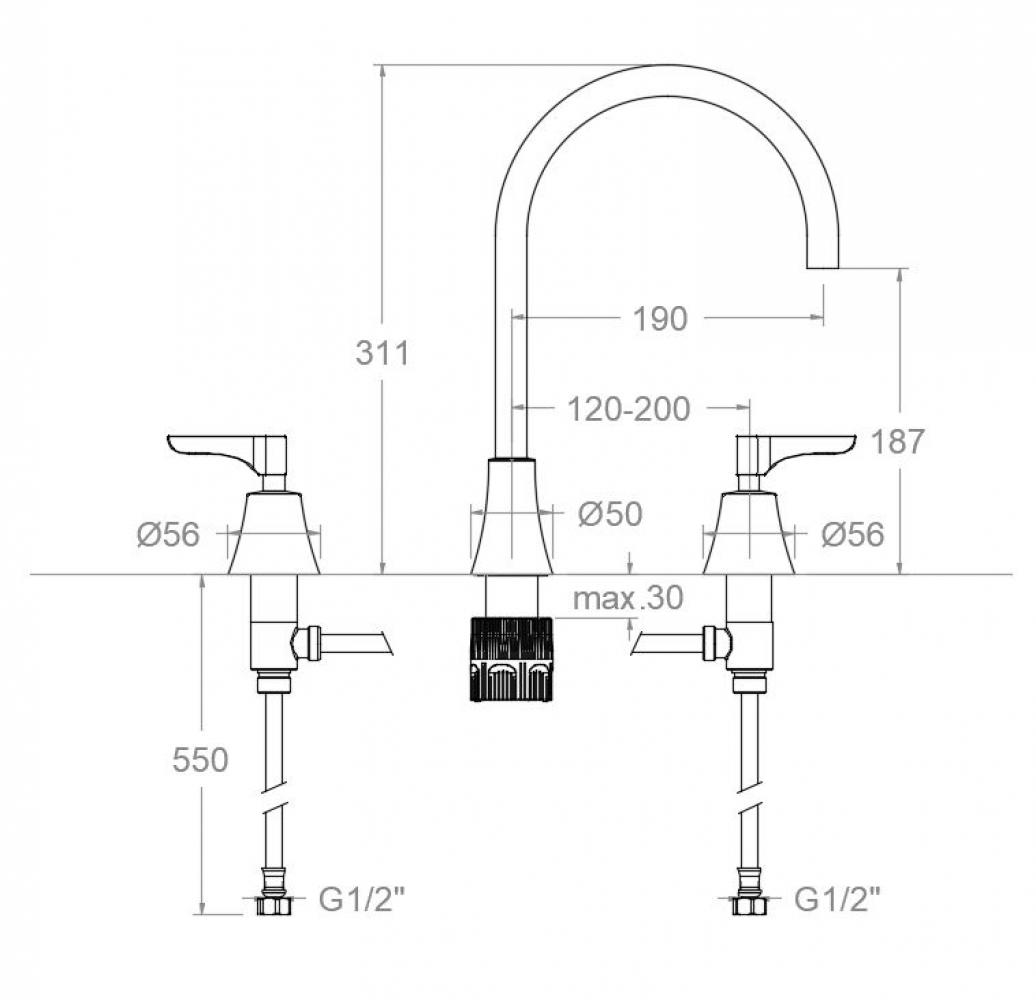 Two-handle tall basin or sink tap for countertop installation, with linear handles, 190 mm spout and 360º swivel, patented anti-corrosion system. Highly resistant matt black finish thanks to its electrostatic treatment on galvanised metal.