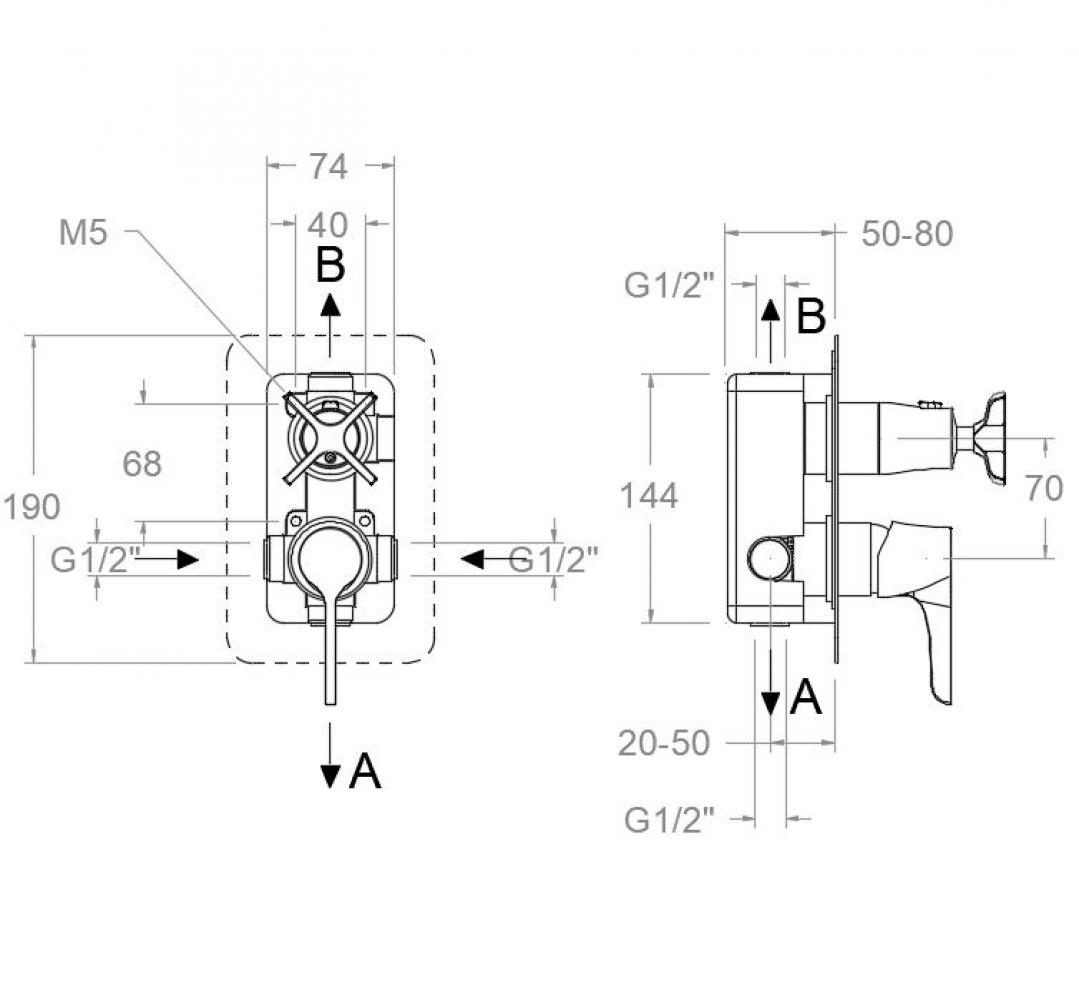 Built-in 2-way shower faucet with ultra-thin metal plate, easy installation due to its compact body, high-resistance graphite finish, 50% water-saving S2 system, and Termostop temperature limiter.