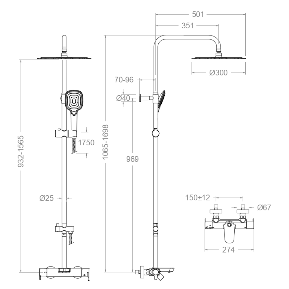 Blautherm, telescopic thermostatic stainless steel shower and bathtub column, handheld shower, Ø300mm round showerhead, brushed copper