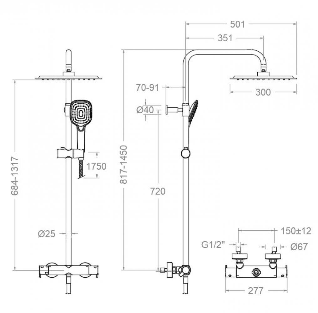 Thermostatic telescopic shower column with 300x300 mm square showerhead. Includes Hot Block safety system to prevent scalding and S2 water-saving system with two-stage handle operation. High resistance matte black finish due to electrostatic galvanisation.