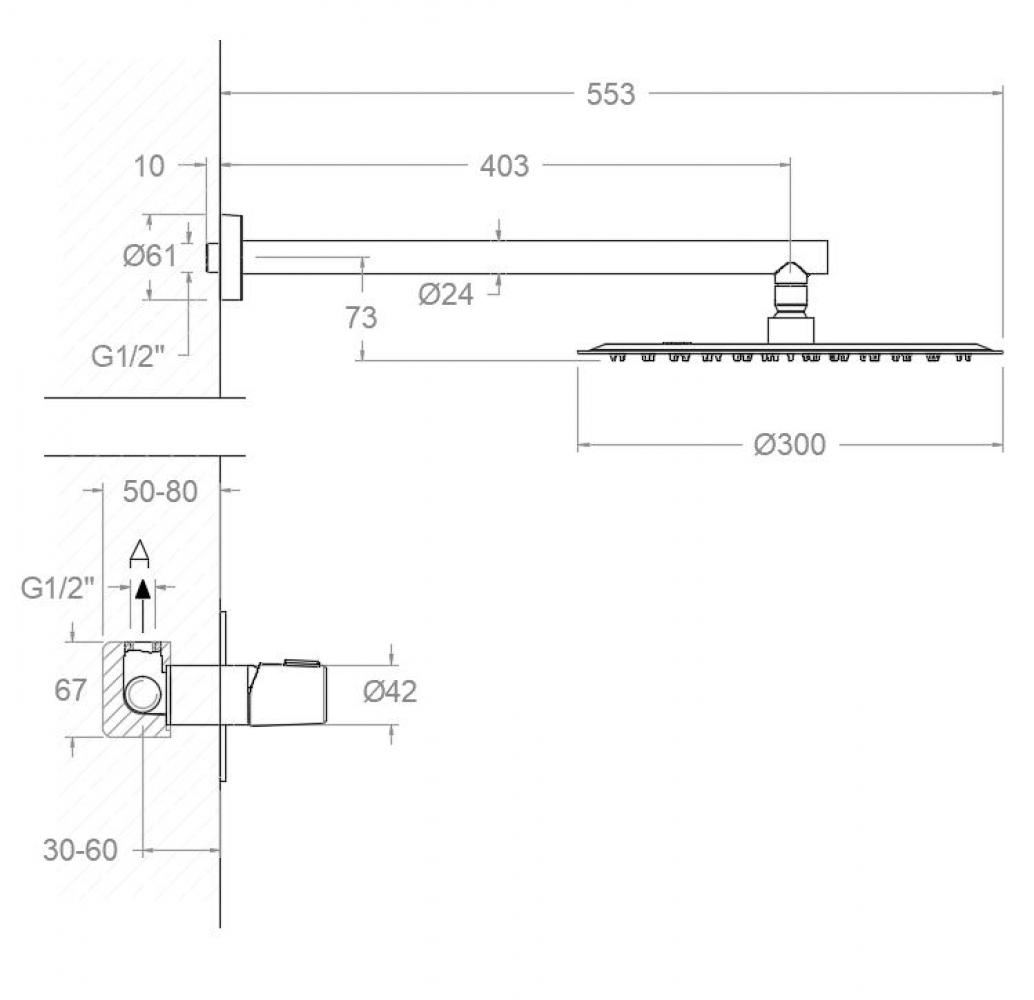 Conjunto grifo de ducha empotrado de 1 vía con rociador mural ABS hidro oxigenado de Ø300mm,sistema S2 de ahorro de agua del 50%,limitador de temperatura y ánodo de sacrificio,sistema anticorrosión patentado,Acabado negro mate de alta resistencia por su tratamiento electrostático sobre galvanizado.