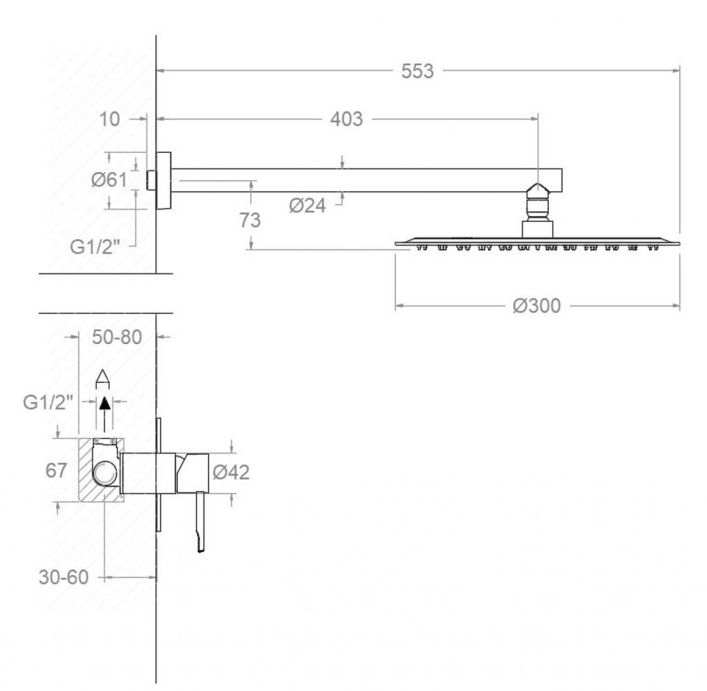 Conjunto de grifo monomando de ducha empotrado de 1 vía con rociador metálico redondo de 300mm. Con sistema S2 de ahorro de agua del 50% y limitador de temperatura. Acabado oro cepillado de alta resistencia por su tratamiento electrostático sobre galvanizado.