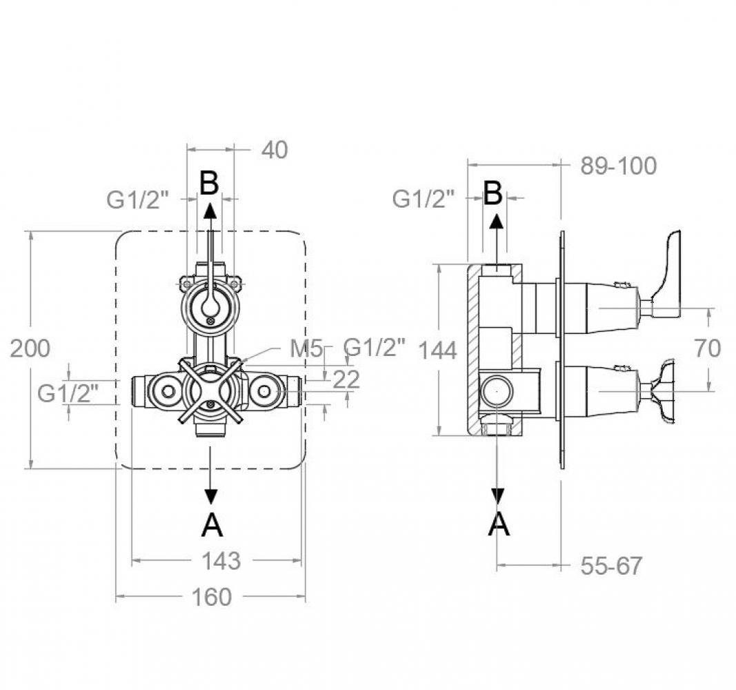 Grifo de ducha empotrado 2 vías con placa metálica extraplana y manetas lineal y en forma de aspa, instalación sencilla y de gran durabilidad por su cuerpo compacto, negro mate de alta resistencia por su tratamiento electrostático sobre galvanizado