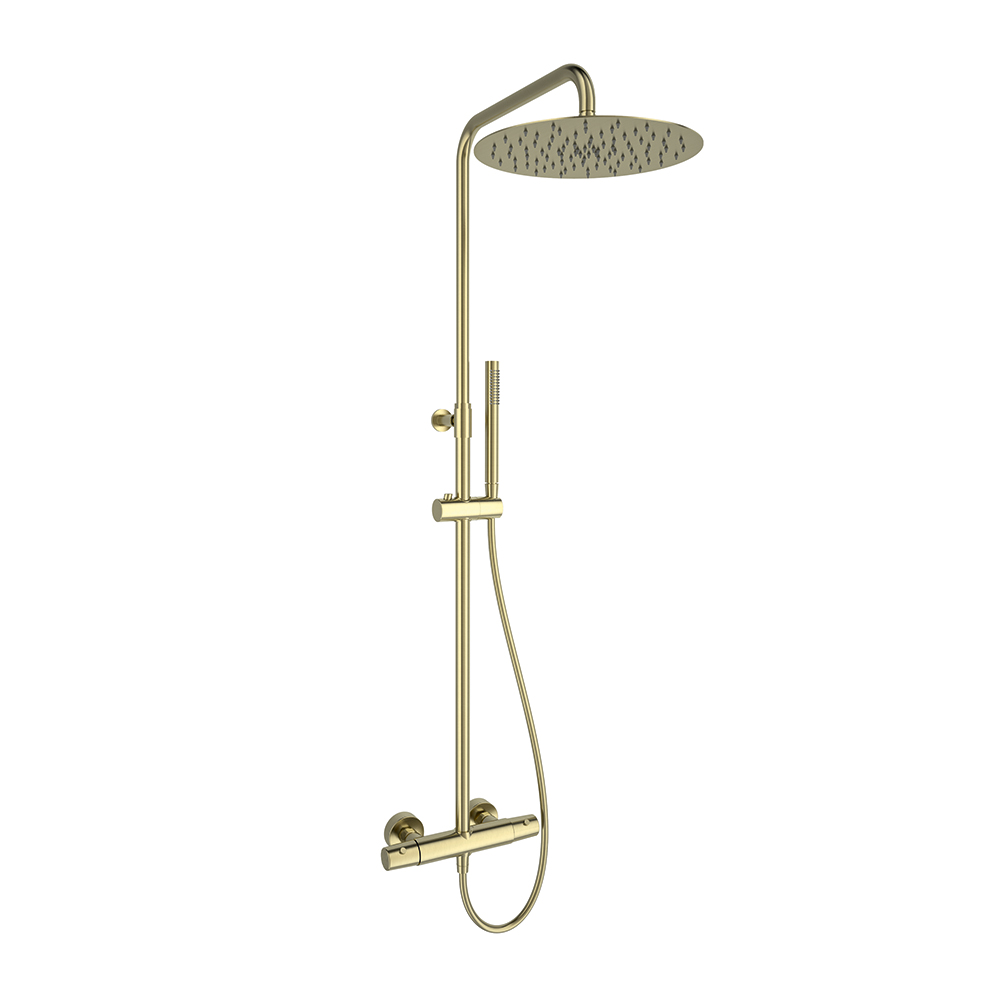 Tzar, columna telescópica termostática, rociador Ø250 mm metálico y accesorios metálicos, oro cepillado Tzar, columna telescópica termostática, rociador Ø250 mm metálico y accesorios metálicos, oro cepillado