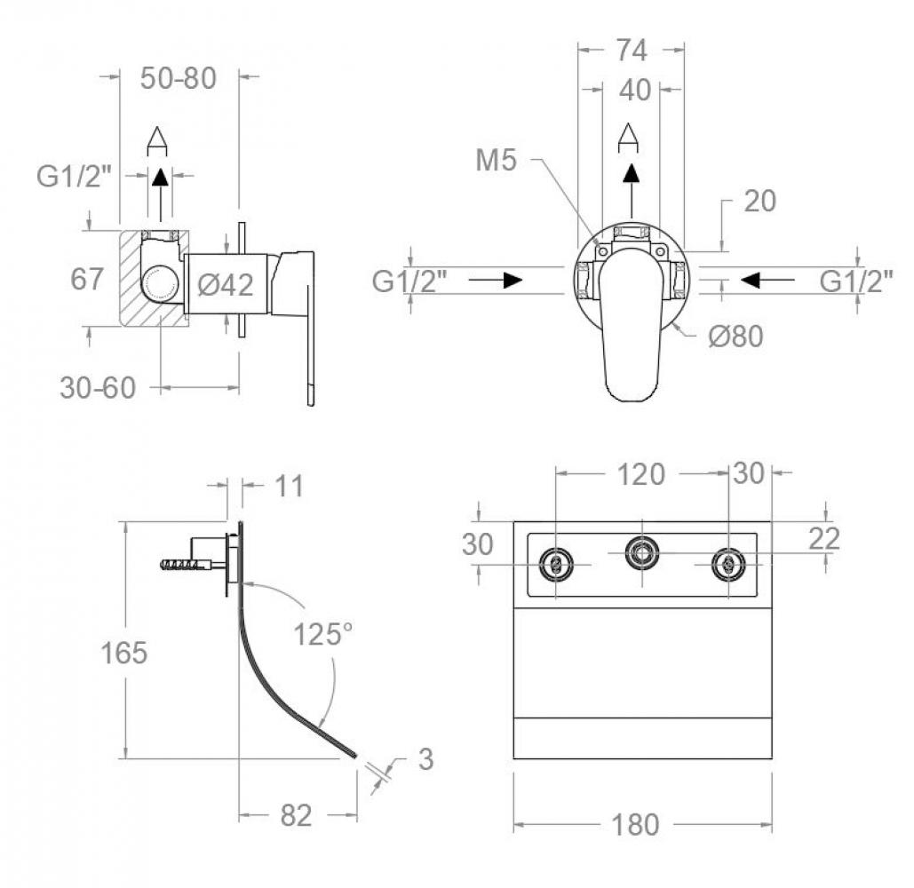 Mitigeur de lavabo encastré mural avec bec cascade extra-plat. Inclut le système Termostop Block limitant la température maximale de l'eau chaude à 38°C et le système d'économie d'eau S2 avec ouverture de la manette en deux phases. Anode sacrificielle anticorrosion en zinc-magnésium. Système Cooltouch qui permet de garder la robinetterie tiède au toucher pour éviter les brûlures. Finition chromée Diamond Finish de haute résistance.