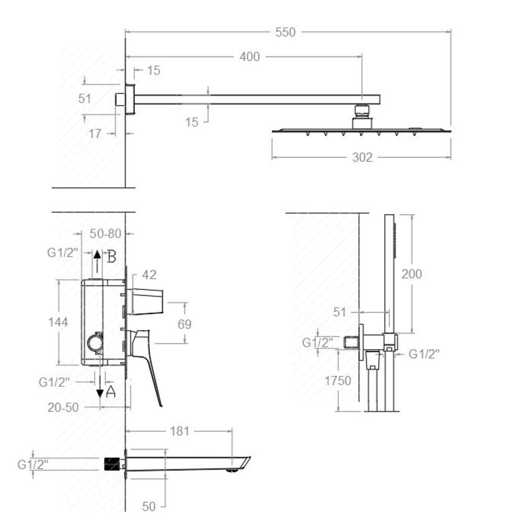 Prisma, conjunto monomando empotrado 3 vías con teleducha y rociador cuadrado de 300mm, oro cepillado