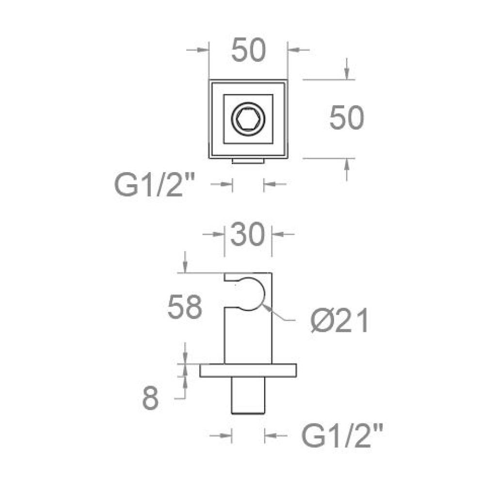 Coude de sortie d'eau fixe, carré, avec clapet antiretour. Finition cuivre brossé de haute résistance grâce à son traitement PVD.