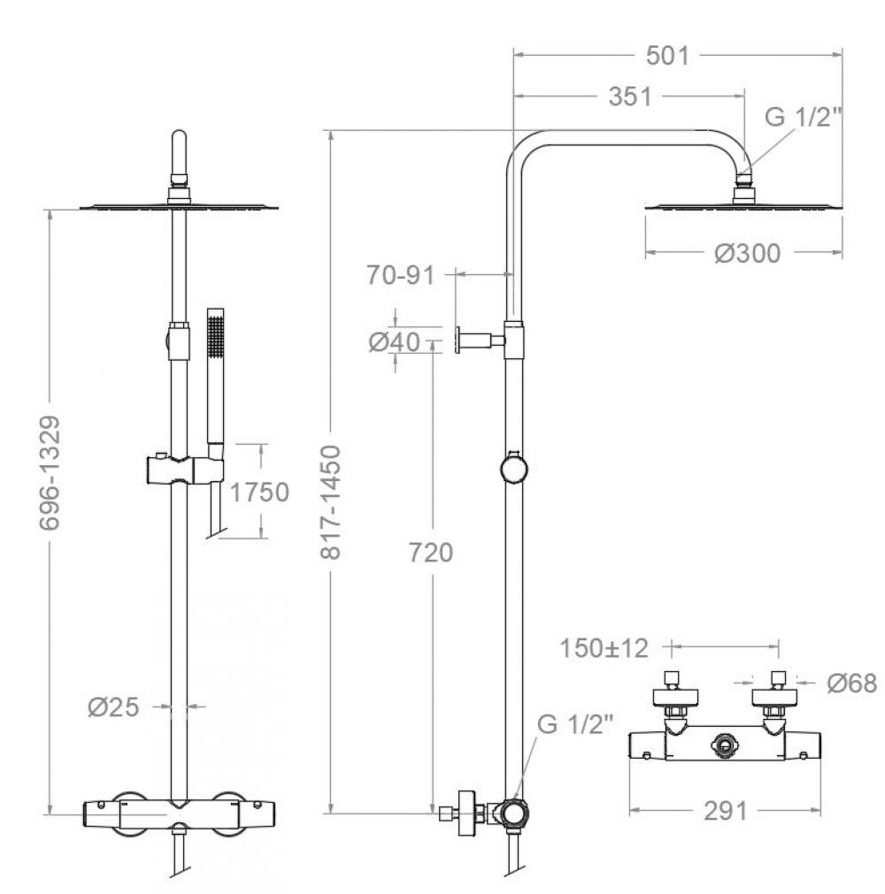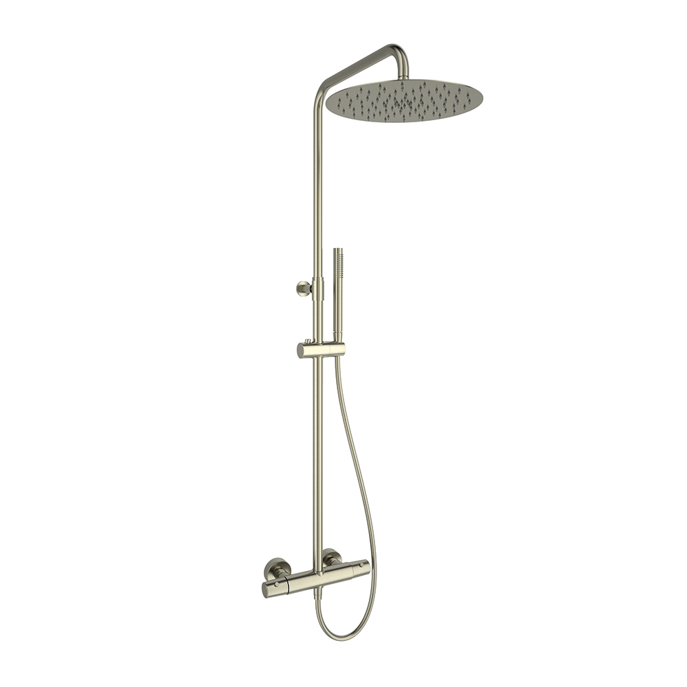 Colonne de douche télescopique thermostatique avec pommeau métallique 300 mm et ensemble de douche. Finition nickel brossé haute résistance grâce à son traitement électrostatique sur galvanisation et système anticorrosion avec anode sacrificielle.