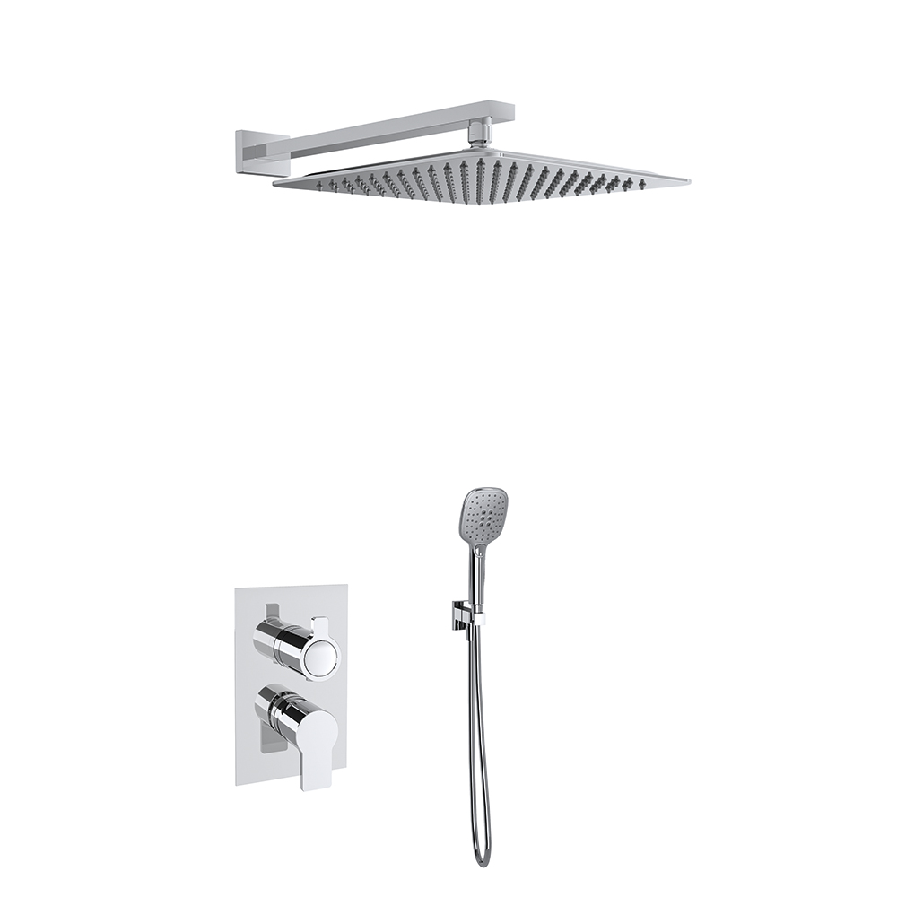 Blautherm. Conjunto monomando metálico empotrado de 2 vías con soporte, toma de agua, teleducha y rociador cuadrado de 300mm.