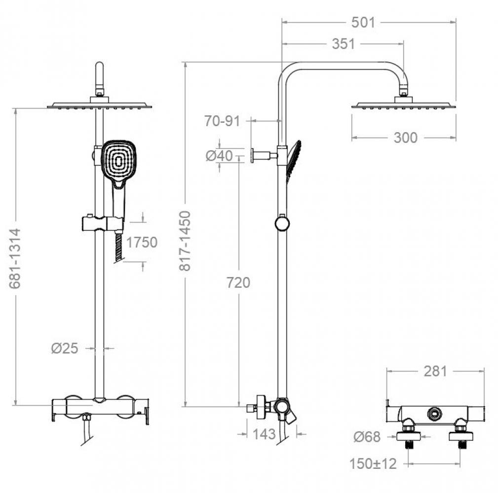 Columna de ducha telescópica monomando, rociador redondo 300x300 mm. Incluye, sistema Hot Block de seguridad antiquemaduras y el sistema de ahorro de agua S2 mediante la apertura de la manecilla en dos fases. Acabado negro mate de alta resistencia por su tratamiento electrostático sobre galvanizado.